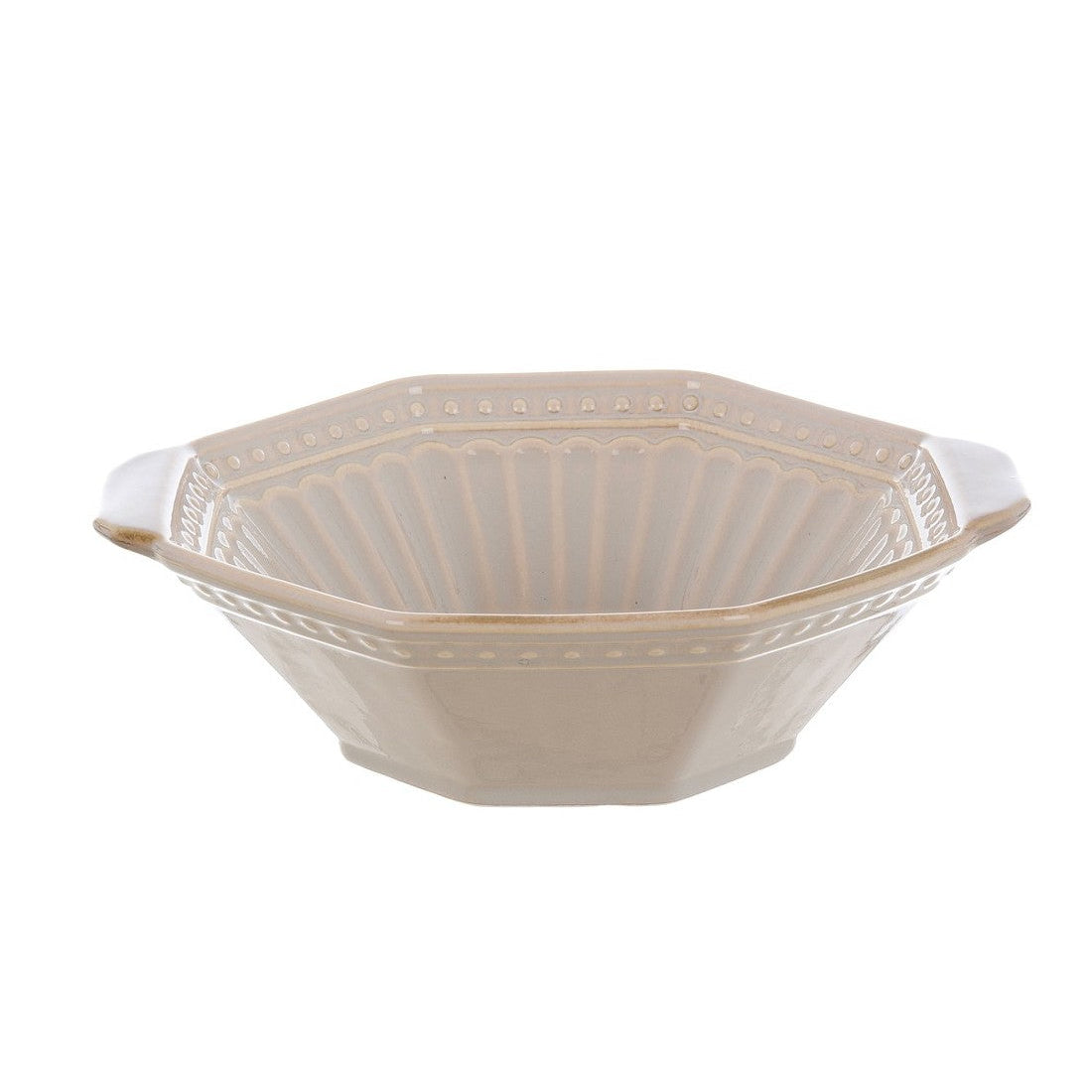 Insalatiera in ceramica con forma ottagonale e manici laterali. Ideale per servire insalate, frutta o pietanze fresche. Il design decorato aggiunge un tocco raffinato alla tavola quotidiana o alle occasioni speciali.