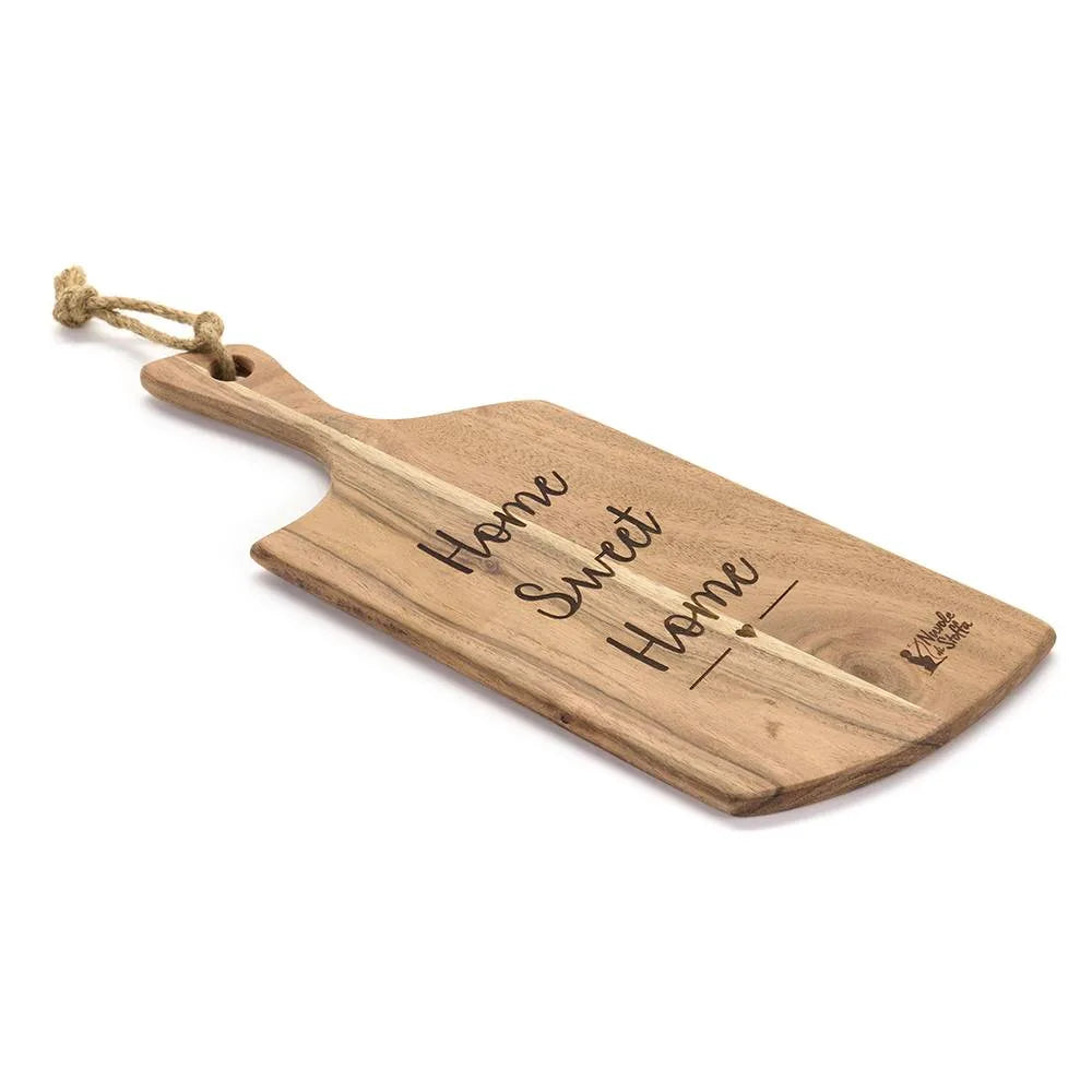 Tagliere in legno di acacia con incisione “Home Sweet Home” e cordino in juta per appenderlo. Perfetto per decorare e servire.
