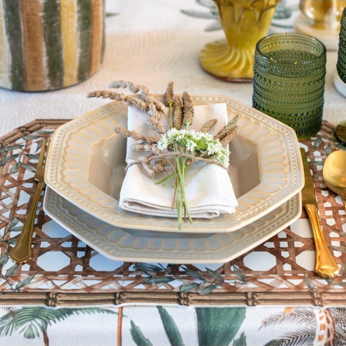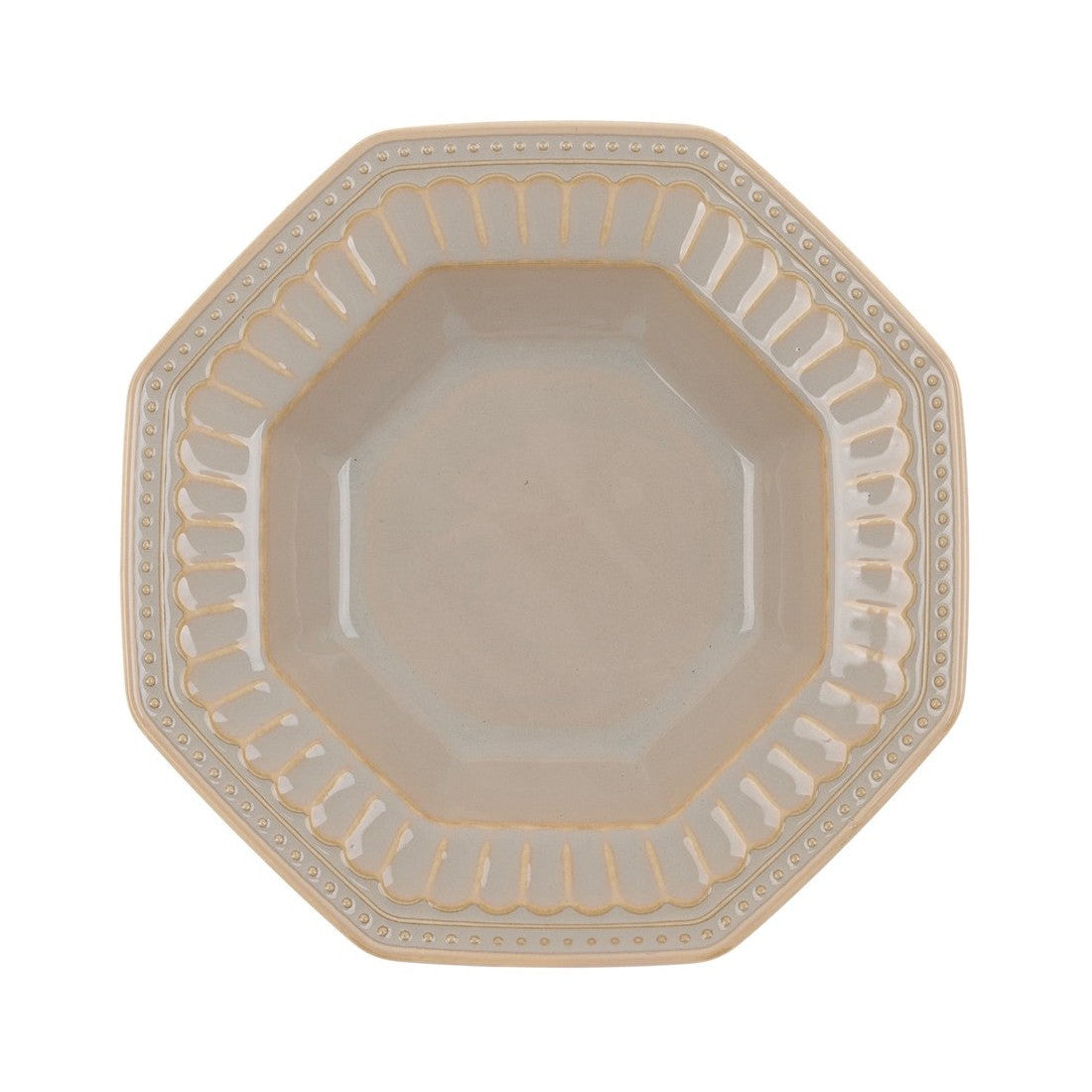 Piatto fondo in ceramica con forma ottagonale e bordo decorato. La tonalità chiara e la finitura lucida lo rendono perfetto per una tavola raffinata. Ideale per servire zuppe e primi piatti, si abbina facilmente a diversi stili di mise en place.