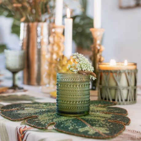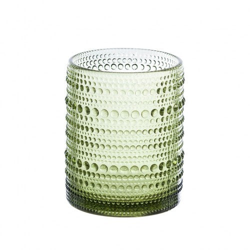 Un bicchiere in vetro verde con texture a bolle che cattura la luce. Ideale per un servizio da tavola originale e colorato, perfetto per pranzi informali o cene speciali.